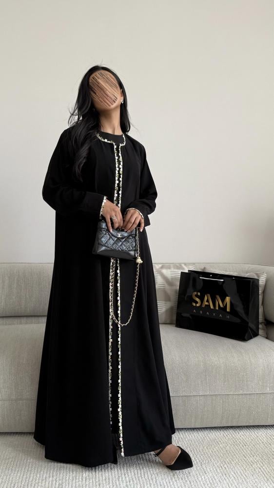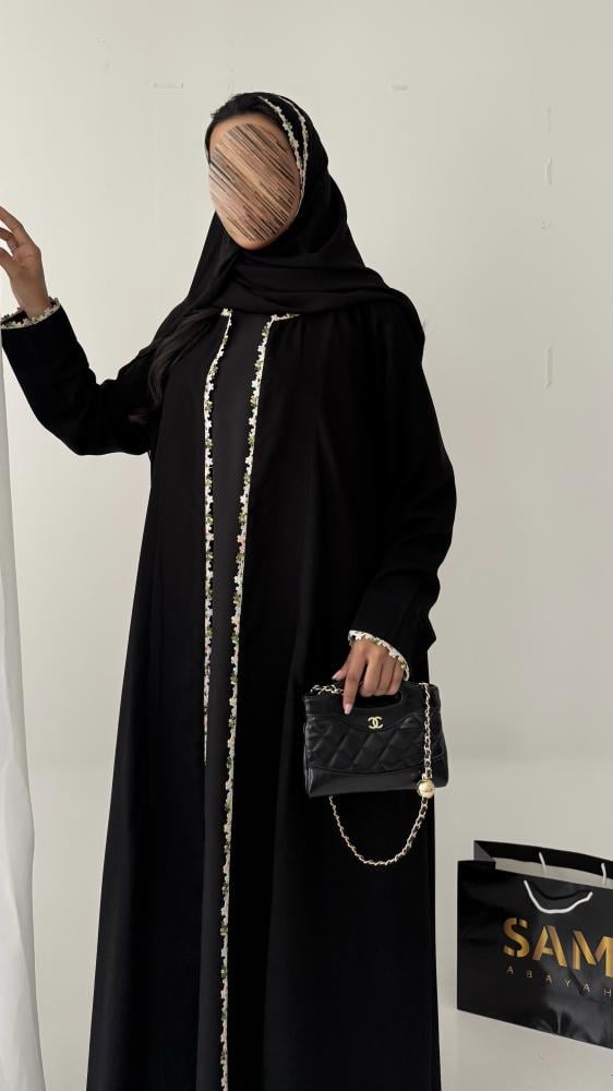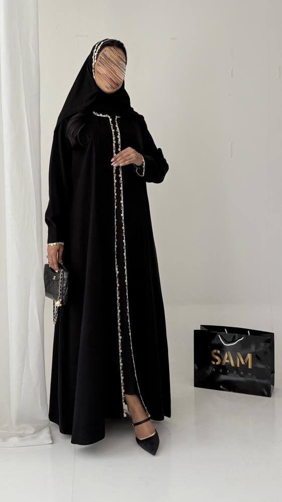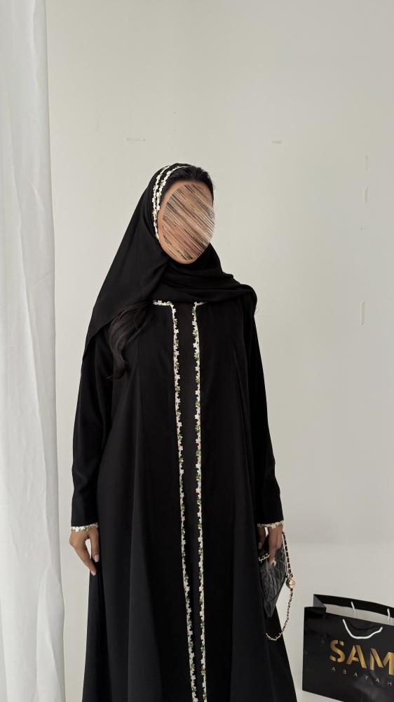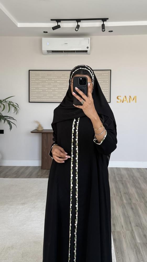 عباية بقماش كوبرا بقصّة A-Line مزينة بورد كروشيه على الأمام والأكمام لإطلالة أنثوية انيقة